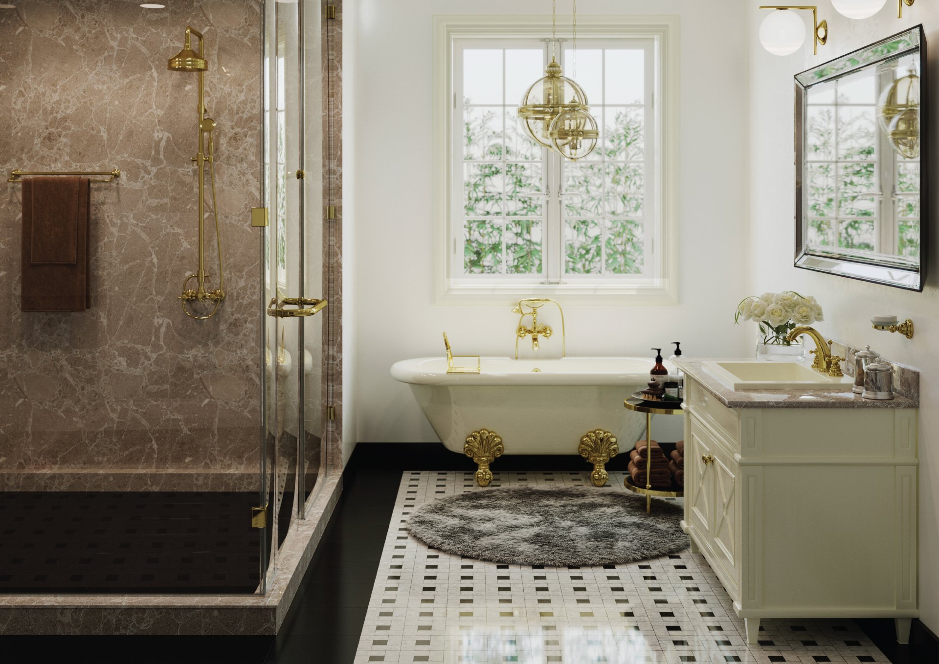 Nét cổ điển, sang trọng và thời thượng của phòng tắm toát lên từ những chi tiết màu vàng đồng thuộc bộ sưu tập Victoria Gold của Häfele.