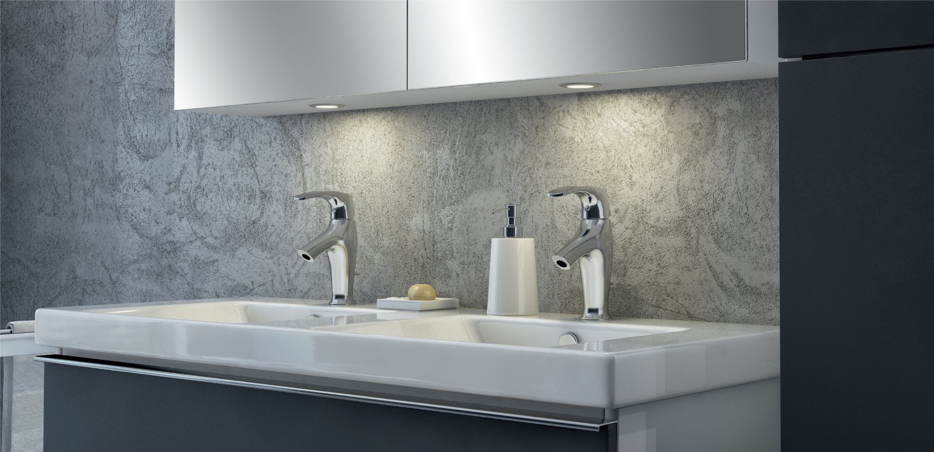 Ánh sáng ở đây không chỉ để chiếu sáng, mà còn là điểm nhấn cho nội thất, tạo không khí thư giãn. Từ đèn chiếu rọi lavabo, đèn âm dọc theo gương hoặc kệ tủ v.v. với các ánh sáng khác nhau: vàng ấm, trắng ấm hay trắng lạnh, bạn có thể lựa chọn loại đèn phù hợp với sở thích và nhu cầu. Càng tuyệt vời hơn khi bạn tích hợp cảm biến chuyển động vào đèn để hệ thống tự động bật sáng khi có người đến gần và tắt khi ra rời đi, vừa tiết kiệm năng lượng, vừa thẩm mỹ và tiện lợi.